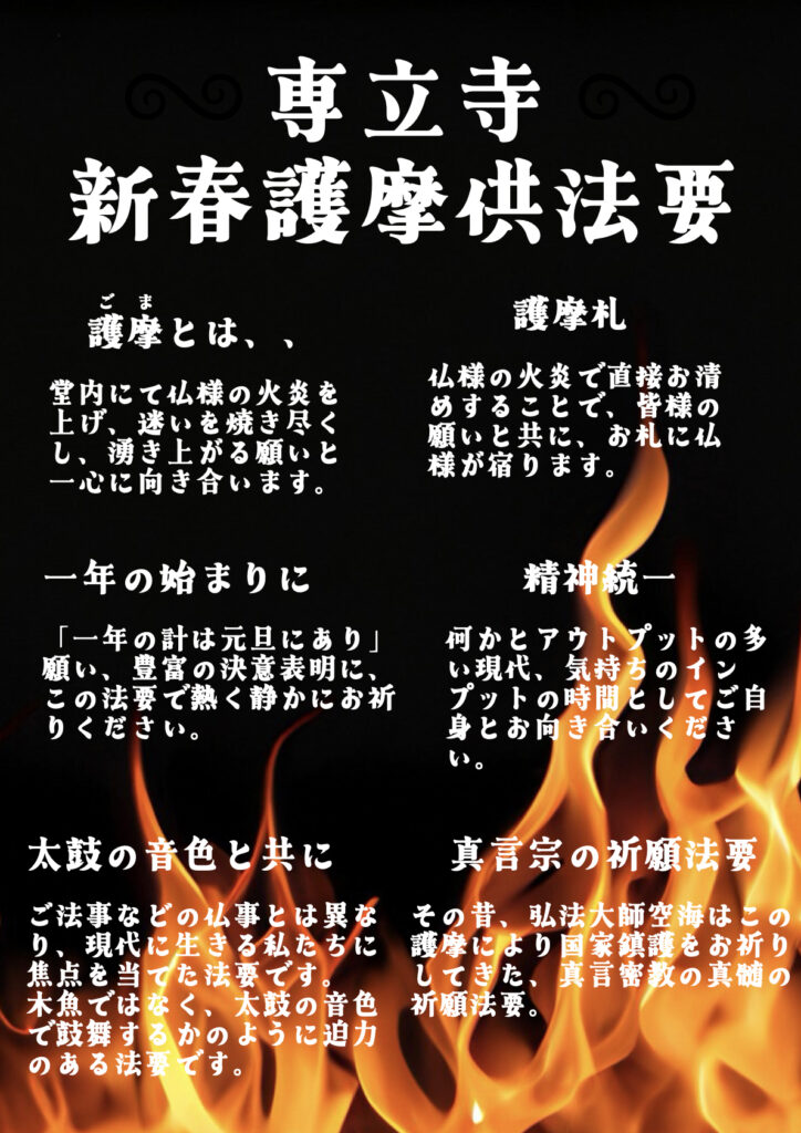 2025年11月16日 / 最終更新日 : 2025年11月16日 まさ お知らせ 令和8年新春護摩供法要、開催のお知らせ 来年、令和8年1月11日(日)13時から厳修いたします。 今年も、法要後にけんちん汁のお振舞いを行います。 新しい年の始まりに皆様でお参りください。 尚、護摩札の申し込み、相談は直接お寺へご連絡ください。 合掌
