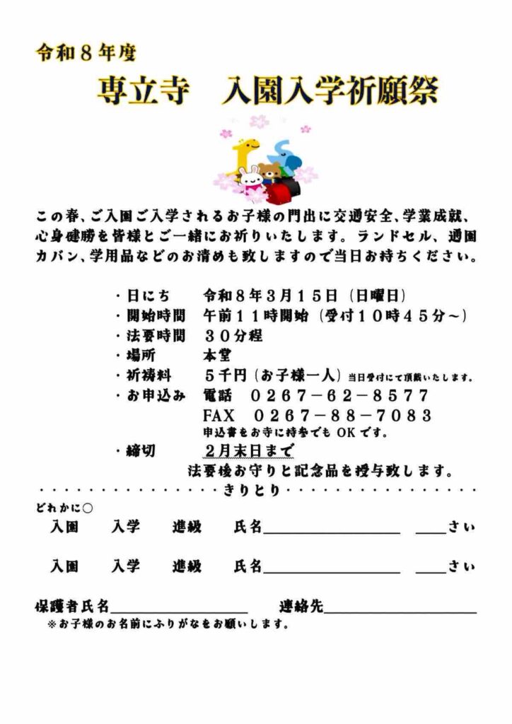 令和8年度入園入学児童祈願祭のお知らせ
